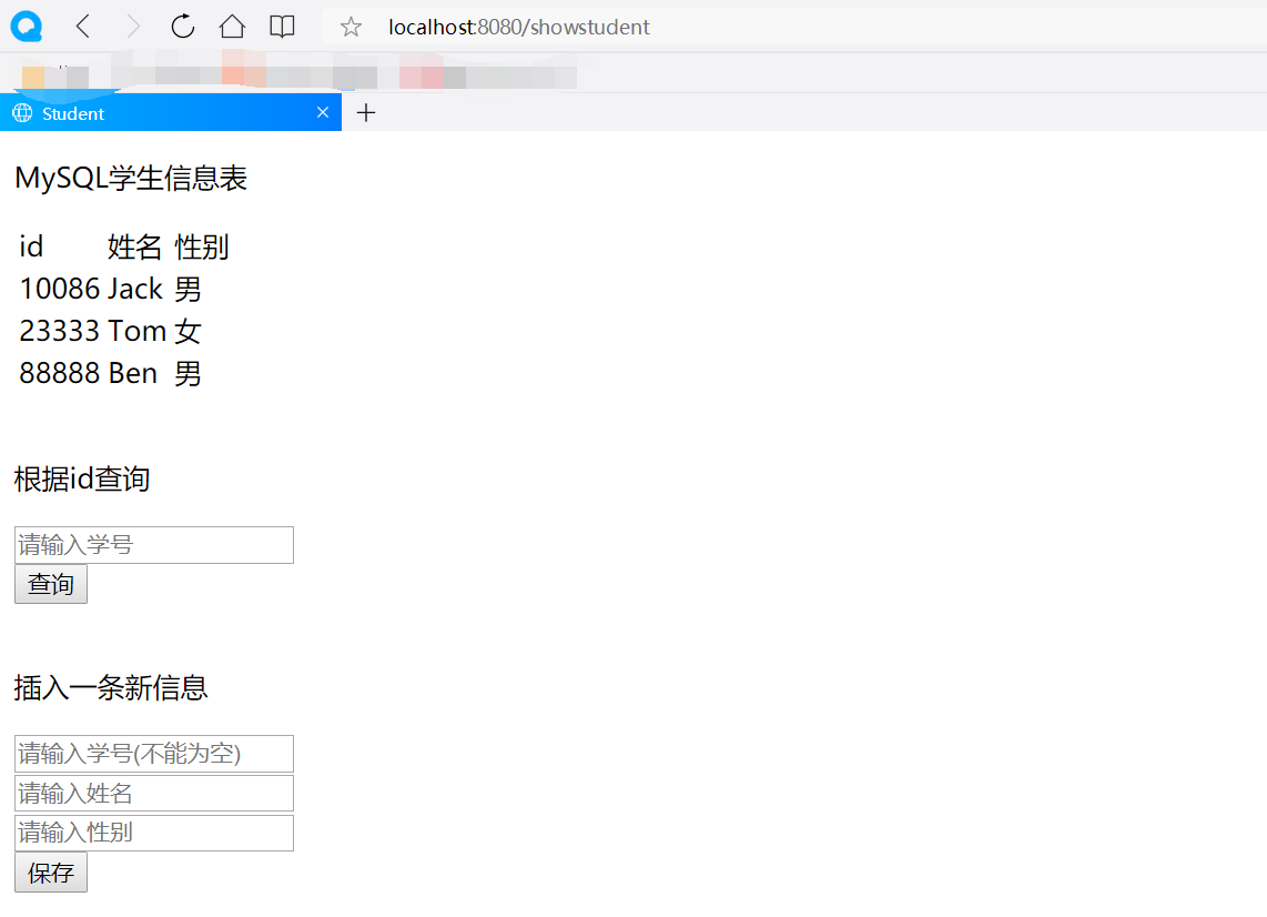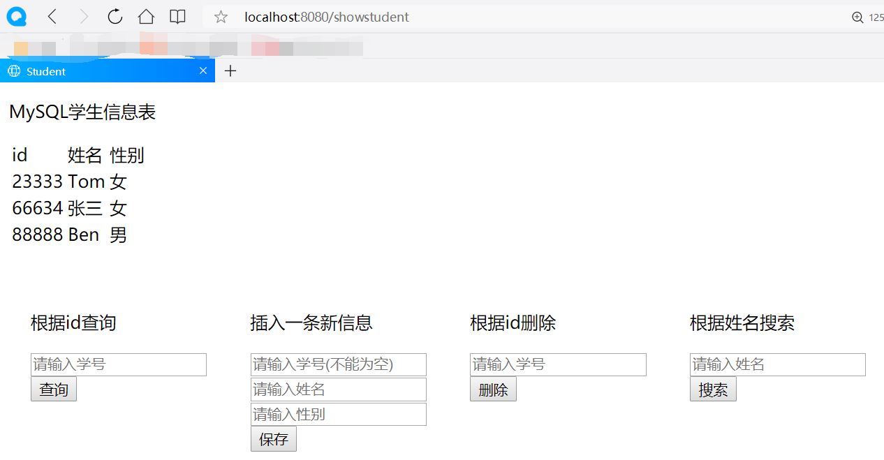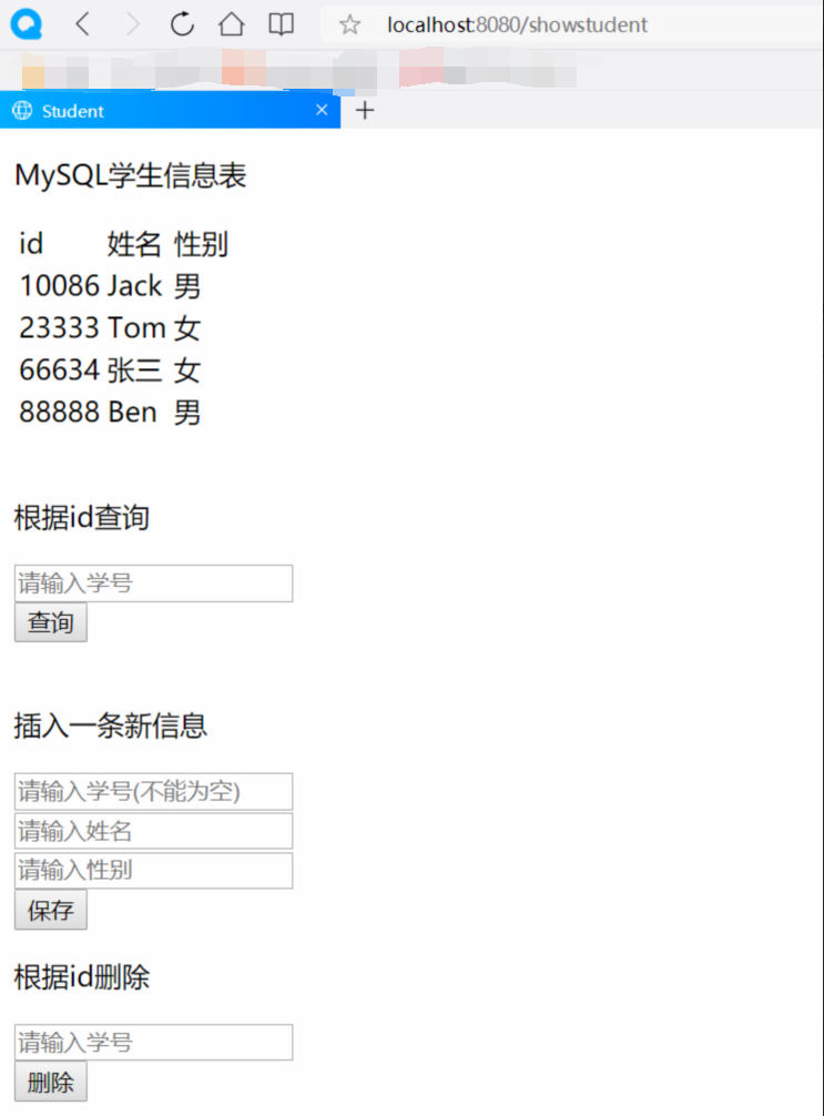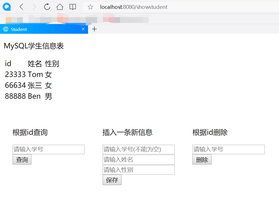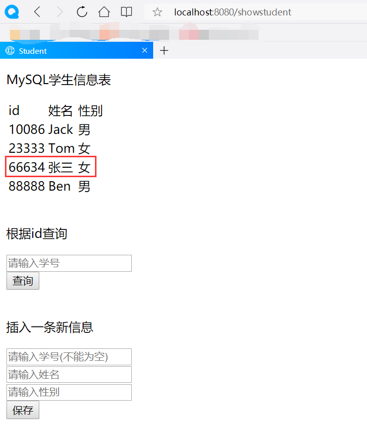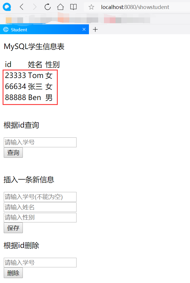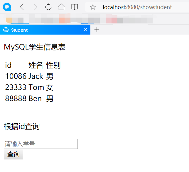 运行程序,访问localhost:8080/showstudent,网页显示学生信息表和根据id查询的表单