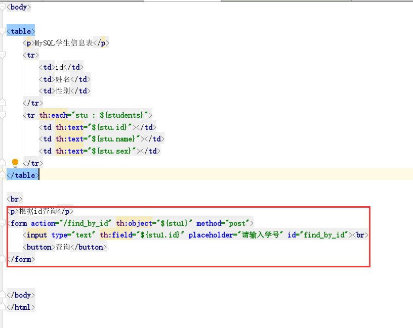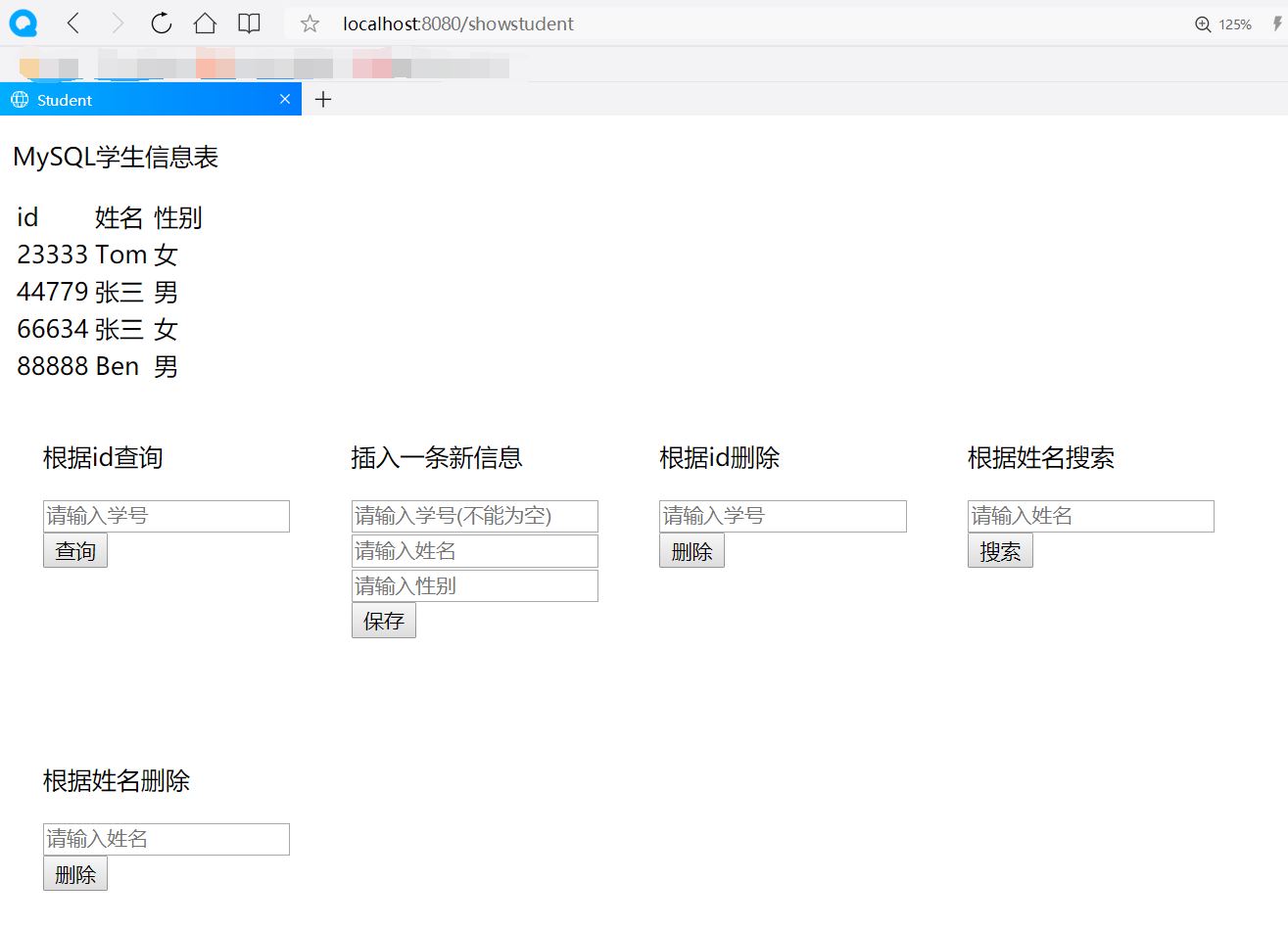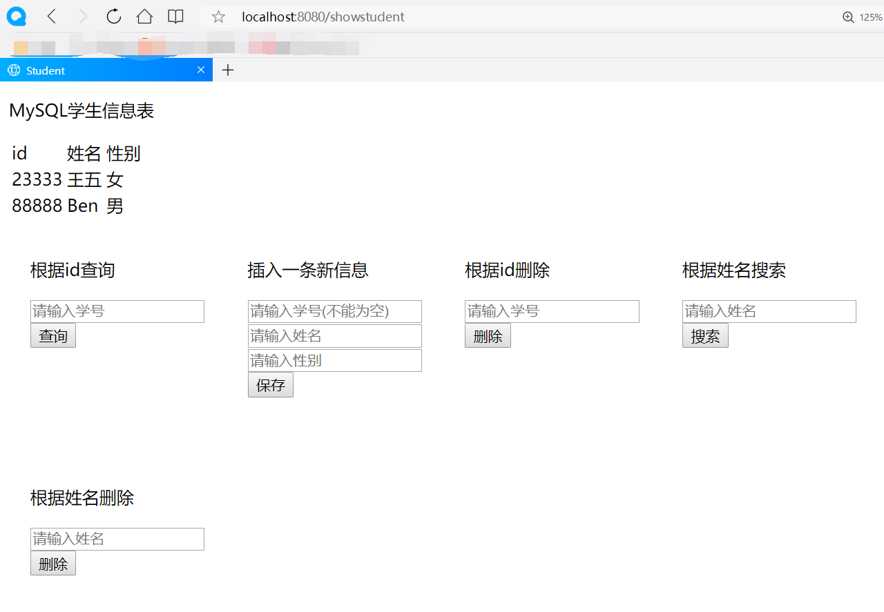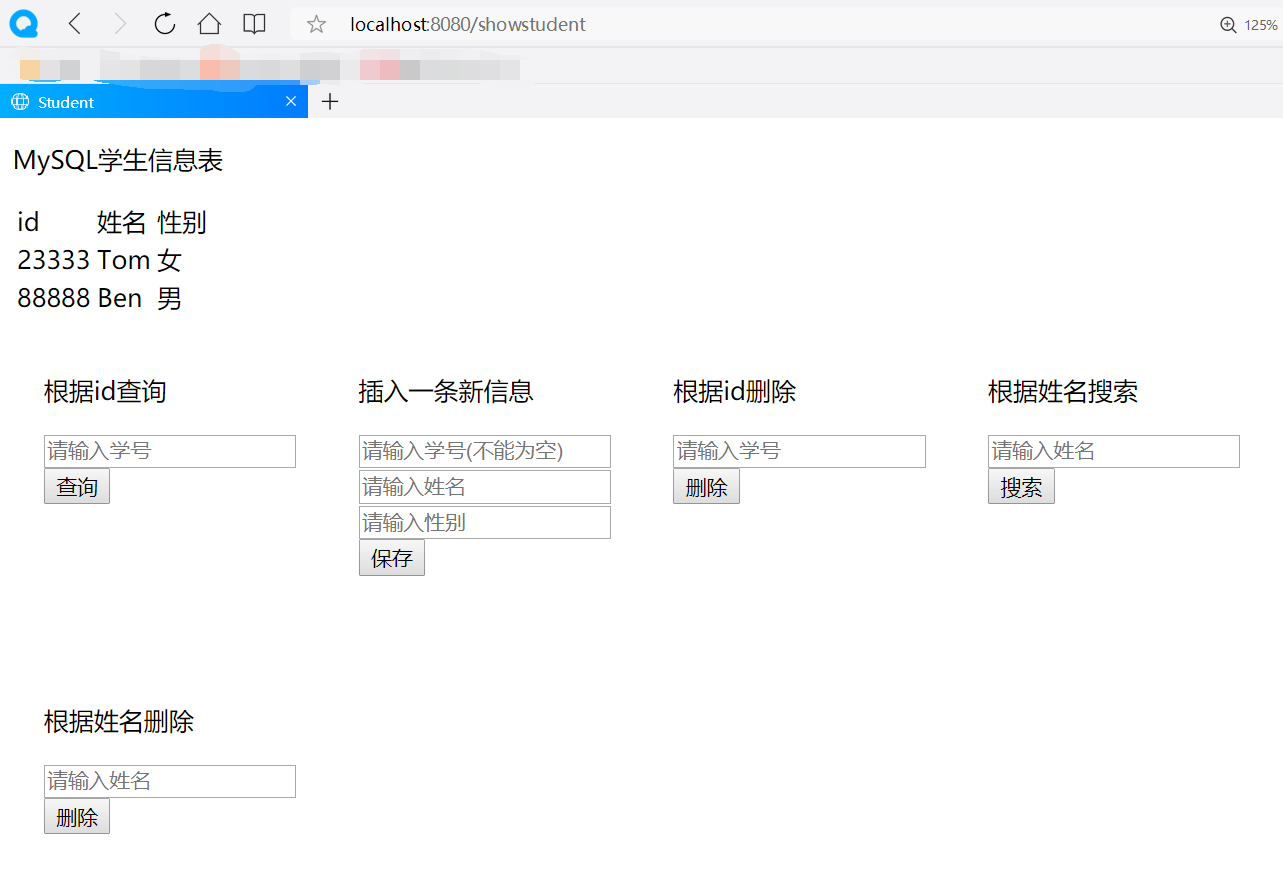 运行程序,访问localhost:8080/showstudent,网页显示学生信息表和根据id查询的表单