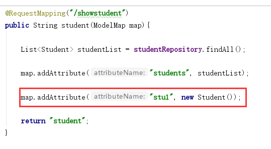 由于stu1我们目前还并没有添加到模型对象中,所以在之前返回student.html的方法中我们需要加上一句
