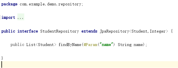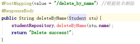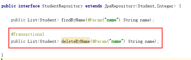 在StudentRepository中添加deleteByName方法,注意这里要加上事务管理的注解@Transactional,这样遇到删除不存在的姓名也不会报错,就不用我们手动先查询再删除了