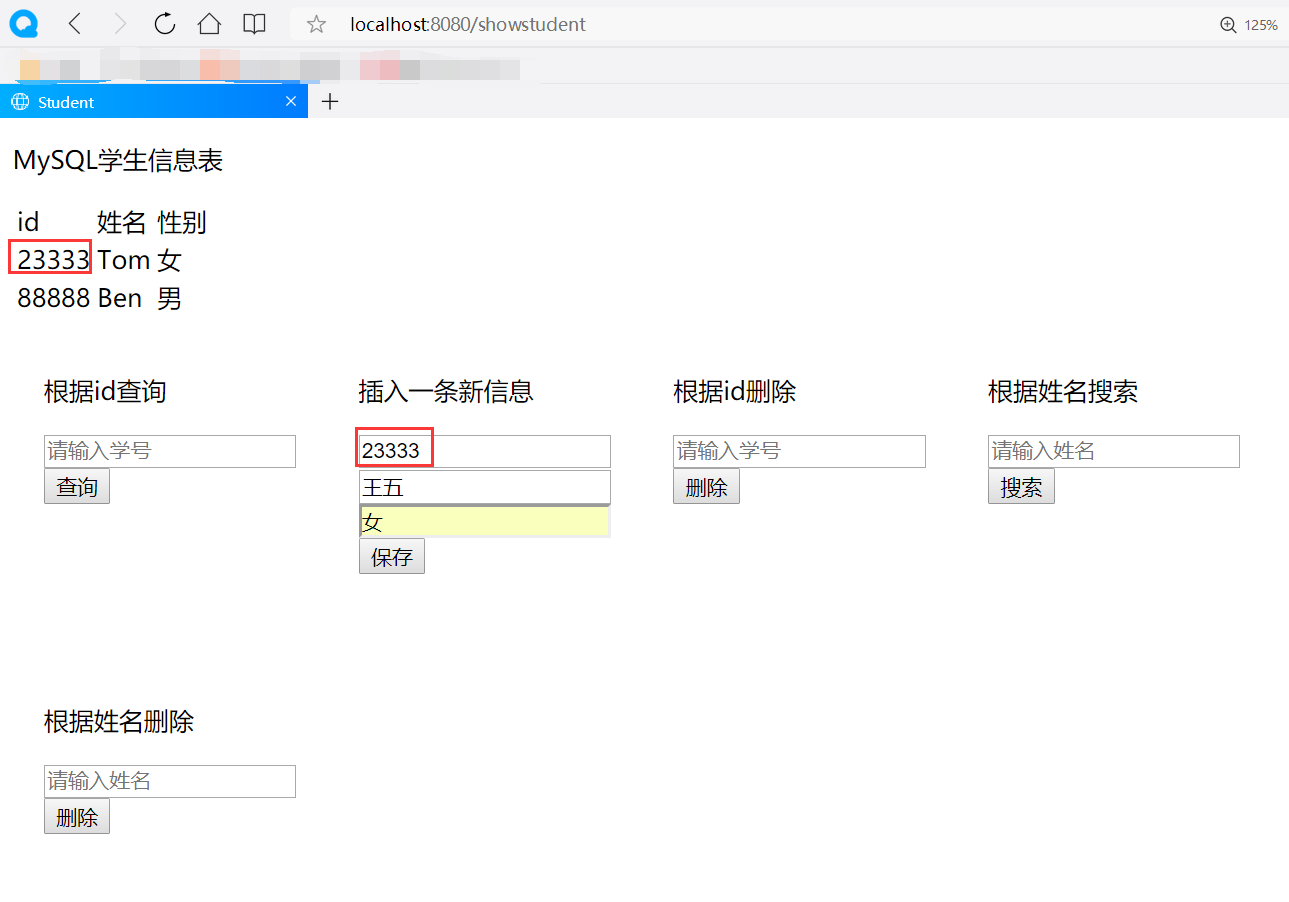 我们来看一下,现在数据库里有一个id为23333的学生名叫“Tom”,性别为女,我在插入这个表单中将23333学号学生的姓名改为“王五”,性别仍然是女,点击保存