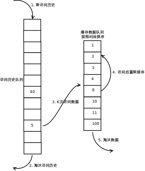 2. 如果数据在访问历史列表里后没有达到K次访问,则按照一定规则(FIFO,LRU)淘汰;