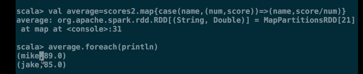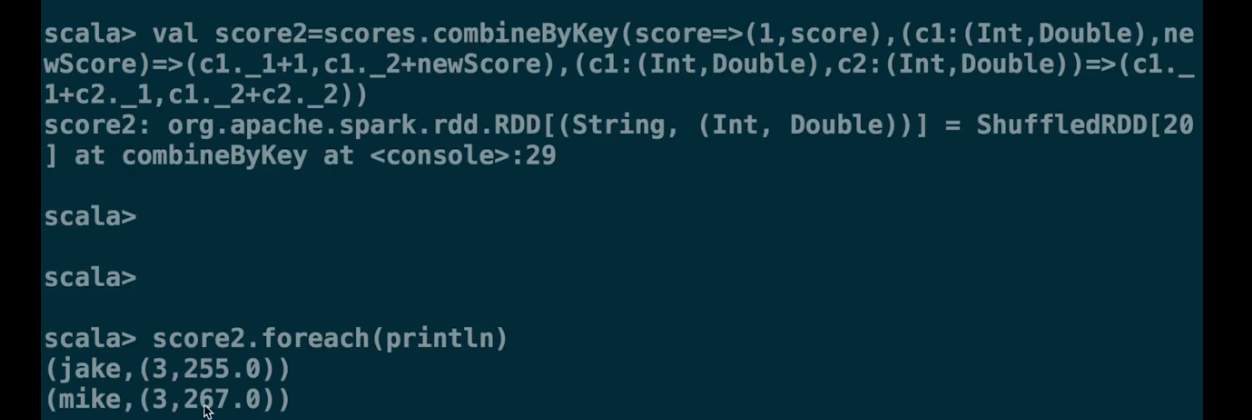 (c1:(Int,Double),c2:(Int,Double))=> c1._1+1,c1._2+c2._2) 即两个分区的汇总值再 进行 科目数和分数的相加