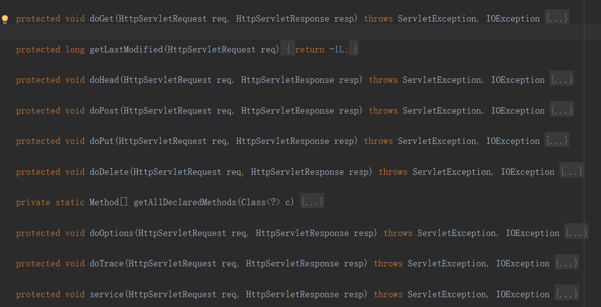 1.2 HttpServlet.这个类虽说继承自GenericServlet,但却没有实现任何接口方法,但实现了直接父类中的service方法,实现了如doGet,doPost等一系列可能用的请求类型,service方法负责分派具体的请求,我想这也是为什么叫Dispatcher的原因。
