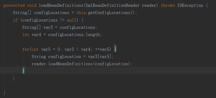 途中标红的便是加载bean的具体过程,其中调用链中最核心的方法是loadBeanDefinitions(DefaultListableBeanFactory var1),这个方法在XmlWebApplicationContext中有实现,最终核心的代码如下: