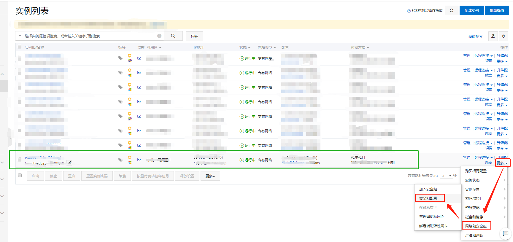1、登录阿里云账号选择“控制台”----->“云服务器ECS”,然后找到自己需要配置端口的服务器信息,点击后面的“更多”----->“网络和安全组”----->“安全配置组”,如下图所示