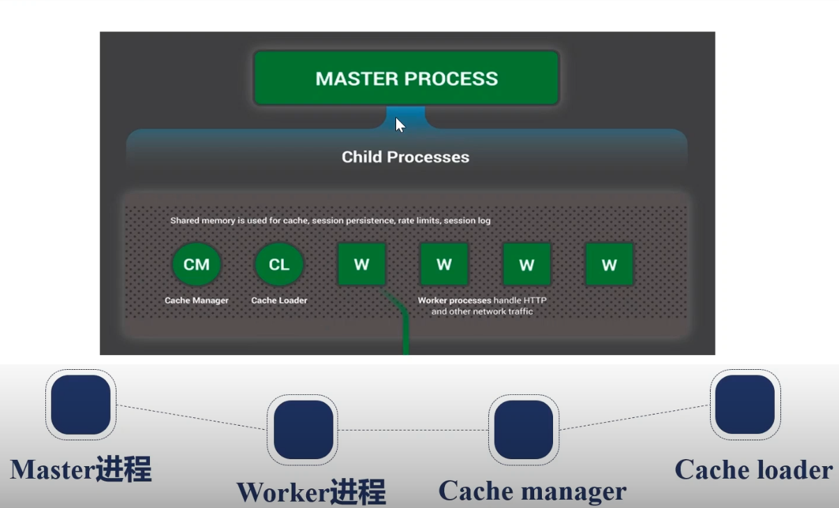 多个子进程:一类worker进程,一类cache进程(Cache Manager和 Cache Loader)