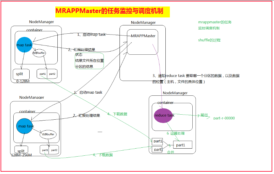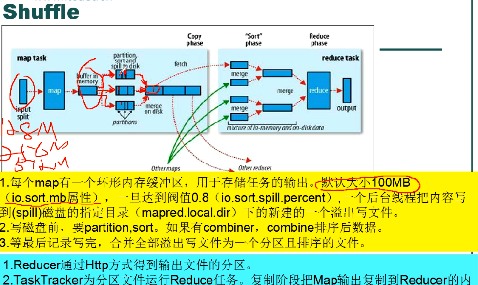 某一个具体的map task进程,输出数据是如何缓存、中间是如何排序、如何分组的,然后转发给reduce,这个过程就叫做shullfe过程。shuffle是分布到整个集群协作运行的
