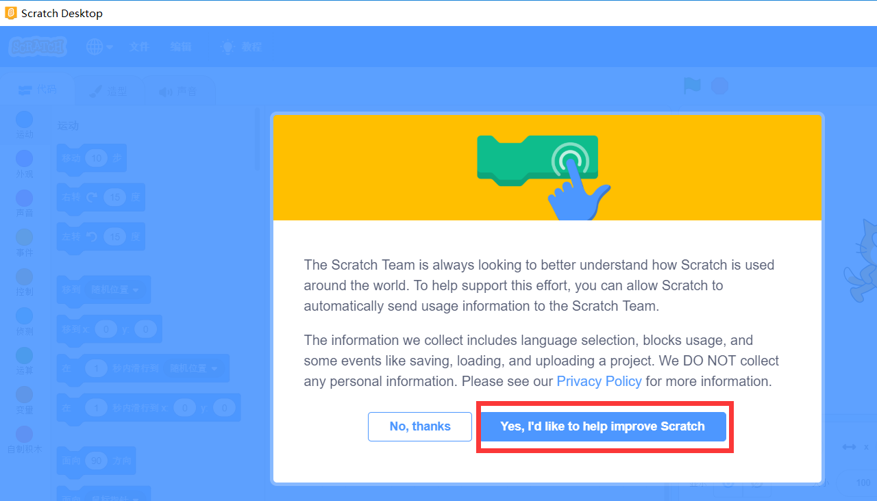 6. 经过耐心等待安装完后,我们的电脑会弹出下面的程序界面,我们点击右边的“yes”,就可以看到我们下载好的 scratch3.0离线编辑器了.