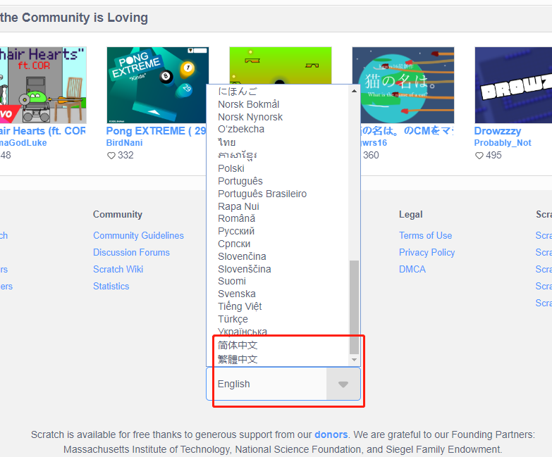 将页面滑动到底部,可以看见有一个“English”语言的方框。点击三角,选择“简体中文”。可以看到页面语言切换成了中文。