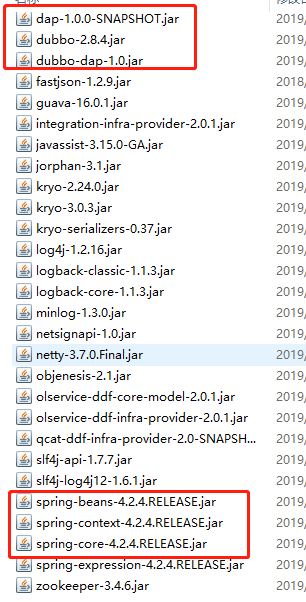 jar包:主要包括了dubbo和spring运行所需。列表如下:包括但不限于红框部分,有些需要根据项目要求来。