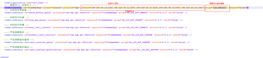 主要配置要素包括:注册中心地址,应用服务器集群组名,以及各个接口的服务ID(group中配置的名称),前面的id可以自己命名