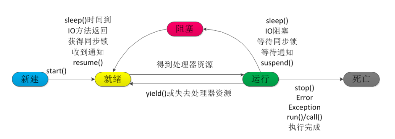 (Blocked)和死亡(Dead)5 种状态。尤其是当线程启动以后,它不可能一直"霸占"着 CPU 独自