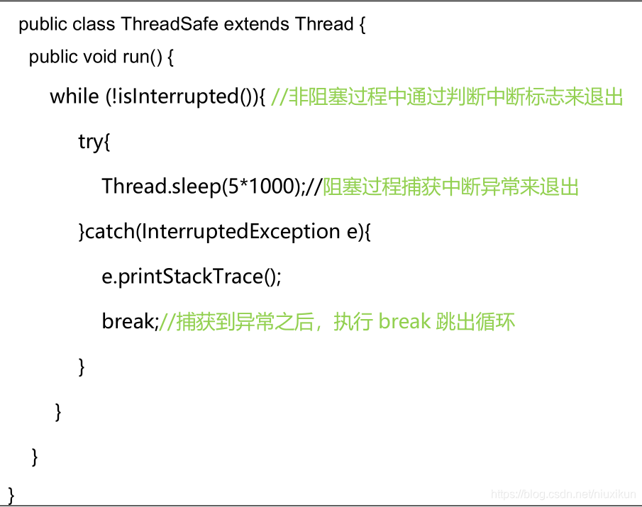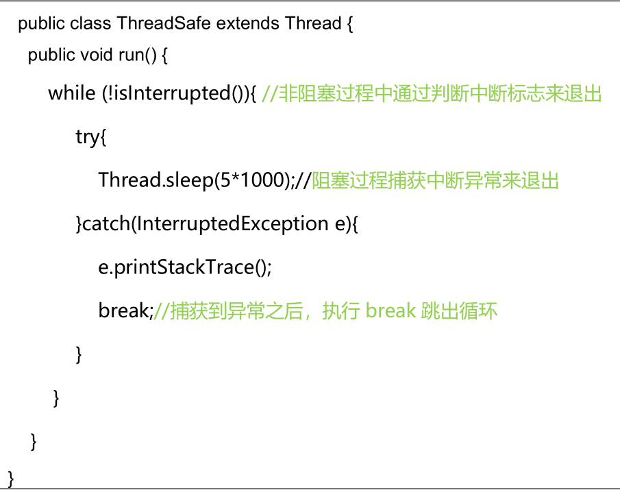 际上是错的, 一定要先捕获 InterruptedException 异常之后通过 break 来跳出循环,才能正