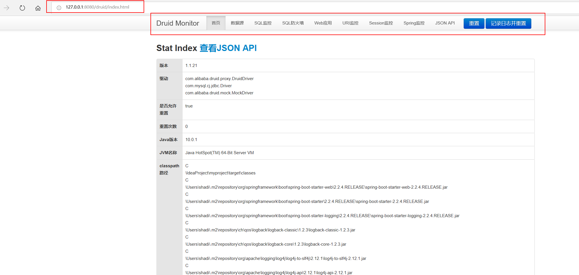 这里注意一点,druid这个依赖的是druid-spring-boot-starter,而不是druid,虽然两者都可以依赖,但druid的话是无法有内置监控页面的。