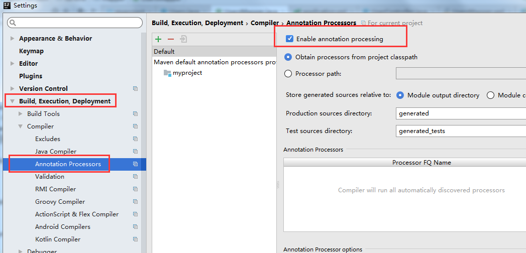 安装完毕,File->Settings->Build,Execution,Doployment->Compiler->Annotation Processors ->打钩 Enable annotation processing