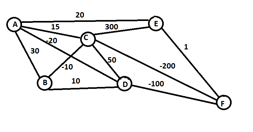 这是最短路径问题的表示。任务是从地点A到地点F,且希望成本尽可能低。两个位置之间的每个边上的数字表示当前路径前行的付出或回报成本。负成本可以理解为有所回报(糖果奖励)。我们将最终的目标可以理解为指定的路线前进后得到的总回报。