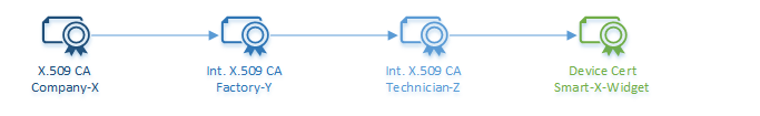 在本例中,X 公司对 Y 工厂进行签名,Y 工厂转而对 Z 技术人员进行签名,而 Z 技术人员最后要对智能 X 小组件进行签名,整个过程中不需要暴漏或传递任何私钥,保证安全。
