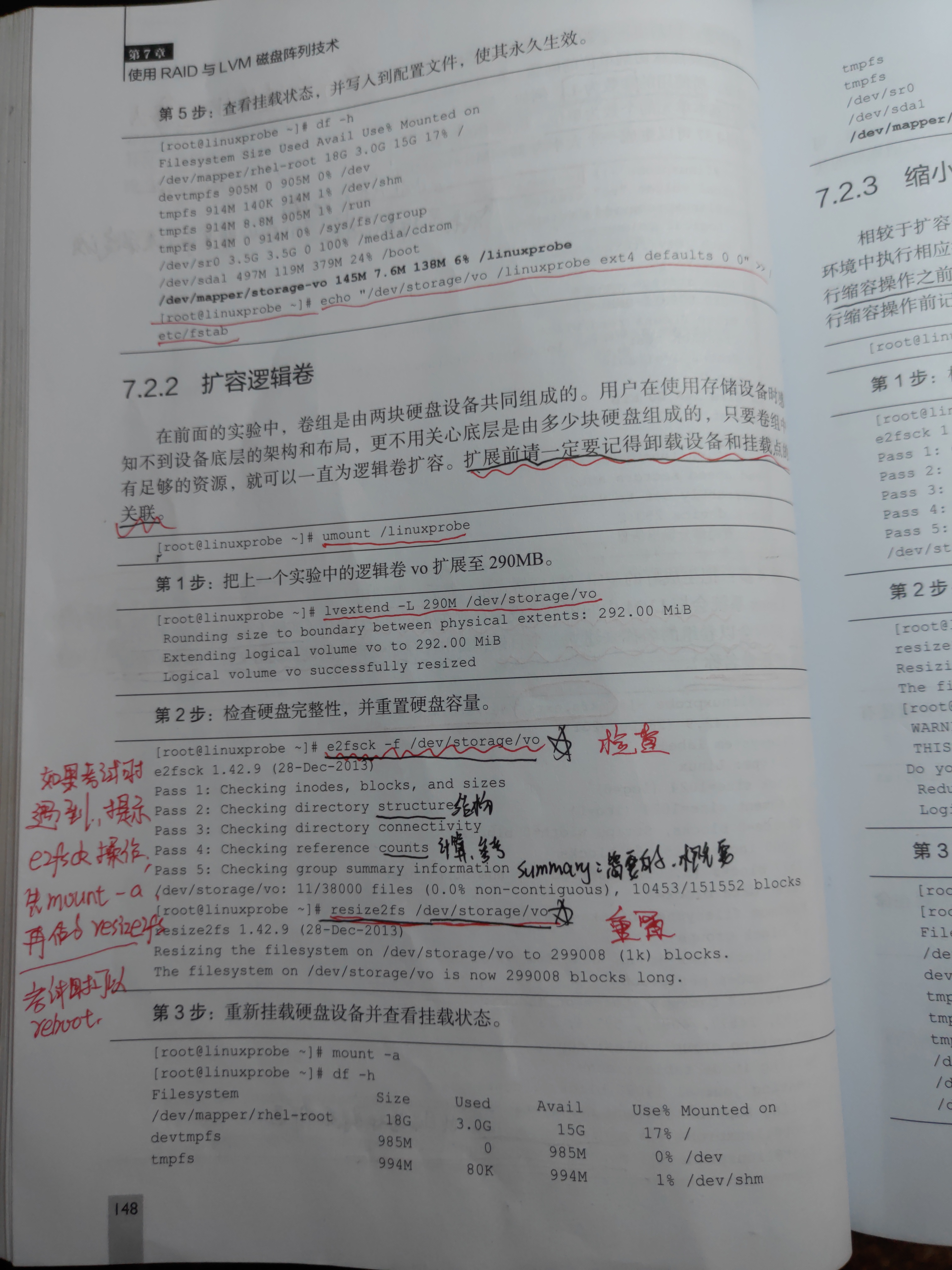 (4)通知系统已经增大了逻辑卷的容量。(在做这一步,用的是RHEL7.0版本的系统,会提示检查硬盘完整性的那一步没有完成,有点bug。这时候可以重复操作检查硬盘完整性命令,没有解决的话,就先挂载上逻辑卷,然后再做该步骤,再不行就重启试一下。)