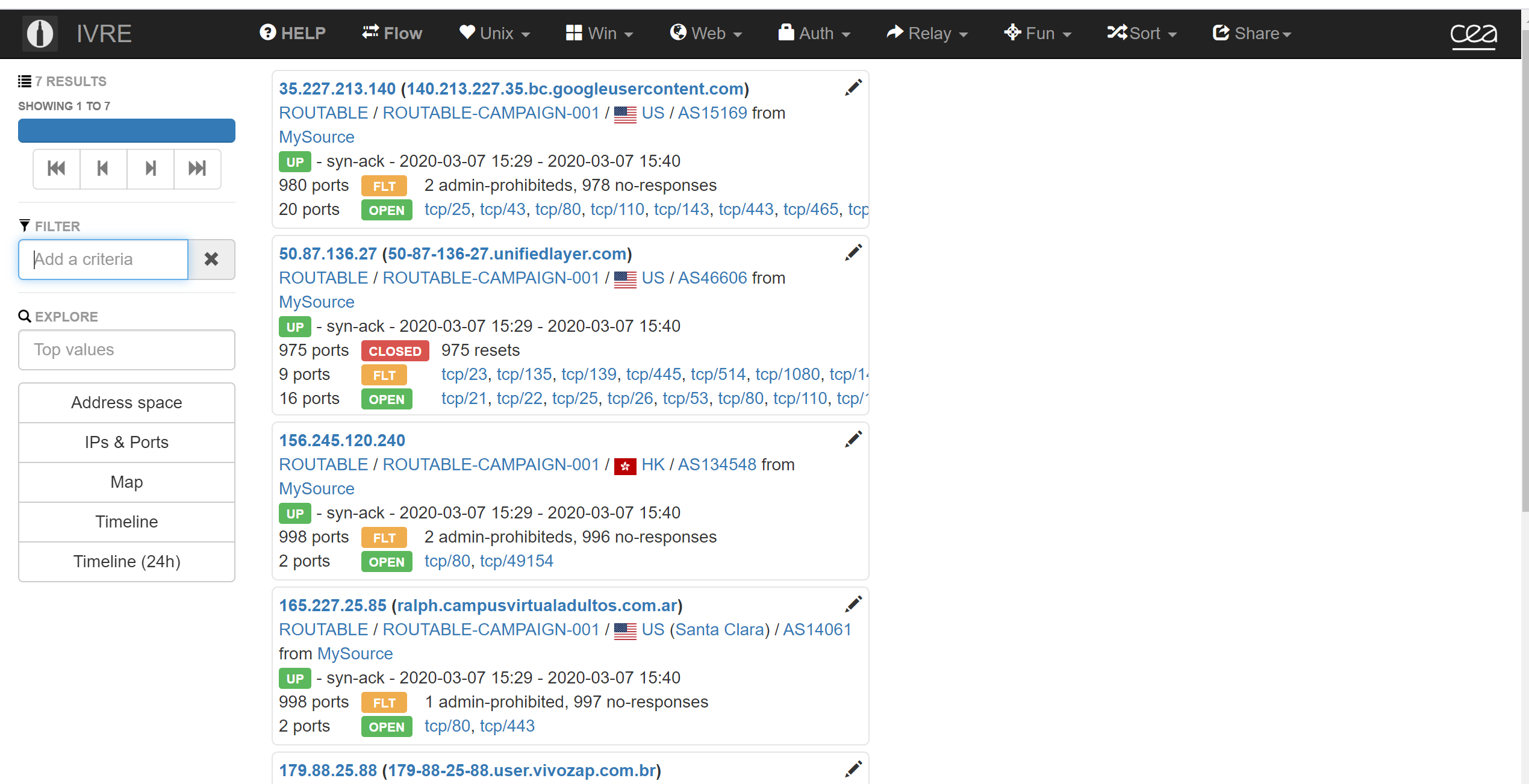 ivre scan2db -c ROUTABLE,ROUTABLE-CAMPAIGN-001 -s MySource -r scans/ROUTABLE/up