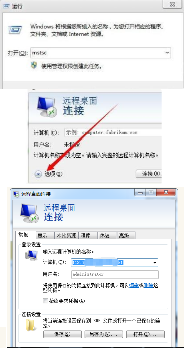2.使用另一台电脑(虚拟机也可以)打开运行输入’mstsc‘,在远程桌面连接下点击选项