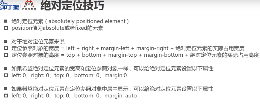 1. 绝对定位元素:positon值为absolute或者fixed的元素