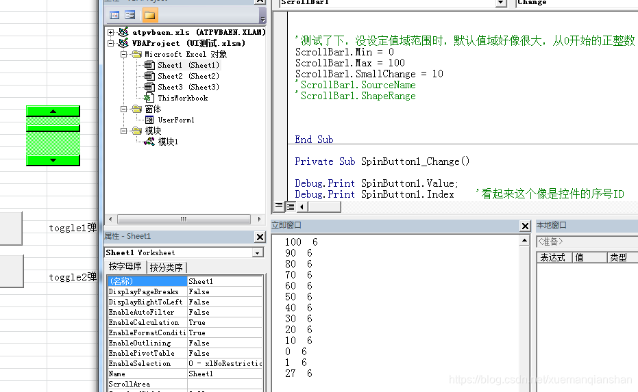 - 很多属性可以在VBE中,写 spinbutton1. 自动出来后查看