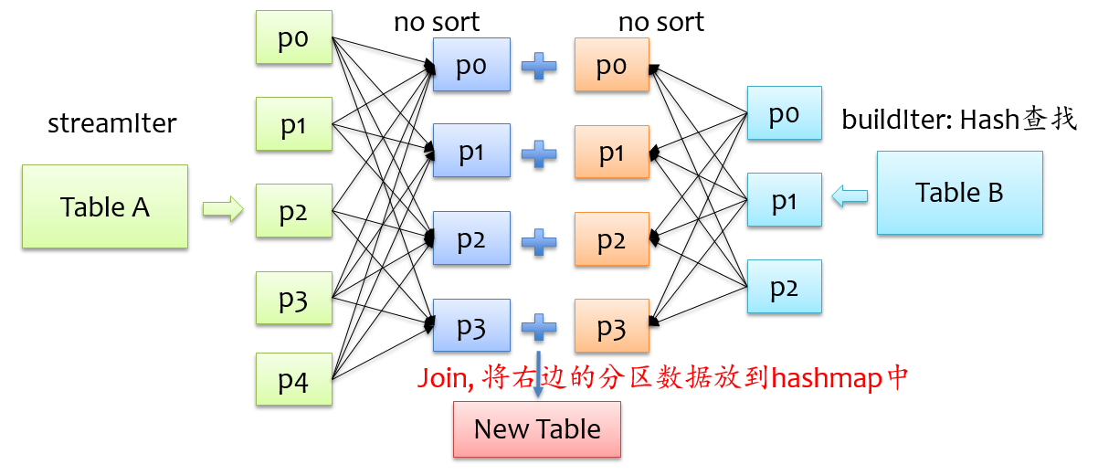 为了能具有相同key的记录分到同一个分区,我们通常是做shuffle,那么如果buildIter是一个非常小的表,那么其实就没有必要大动干戈做shuffle了,直接将buildIter广播到每个计算节点,然后将buildIter放到hash表中,如下图所示。