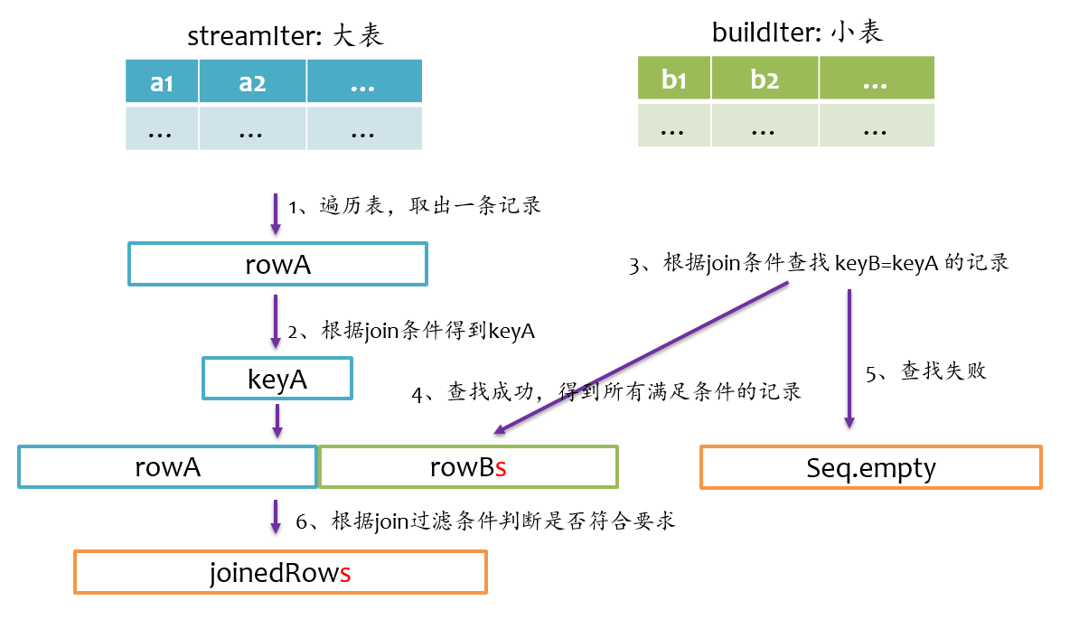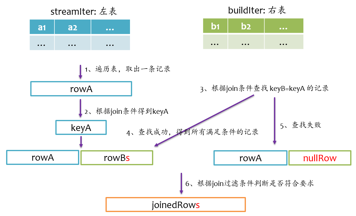 在实际计算时,spark会基于streamIter来遍历,每次取出streamIter中的一条记录rowA,根据Join条件计算keyA,然后根据该keyA去buildIter中查找所有满足Join条件(keyB==keyA)的记录rowBs,并将rowBs中每条记录分别与rowAjoin得到join后的记录,最后根据过滤条件得到最终join的记录。