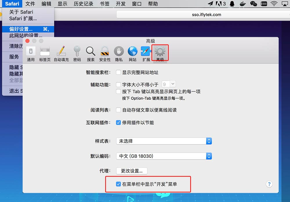 打开Safari偏好者设置,选中“高级菜单”,在页面最下方选中“在菜单中显示开发菜单”的复选框,这样设置完毕就能在Safari菜单中看到开发菜单了。