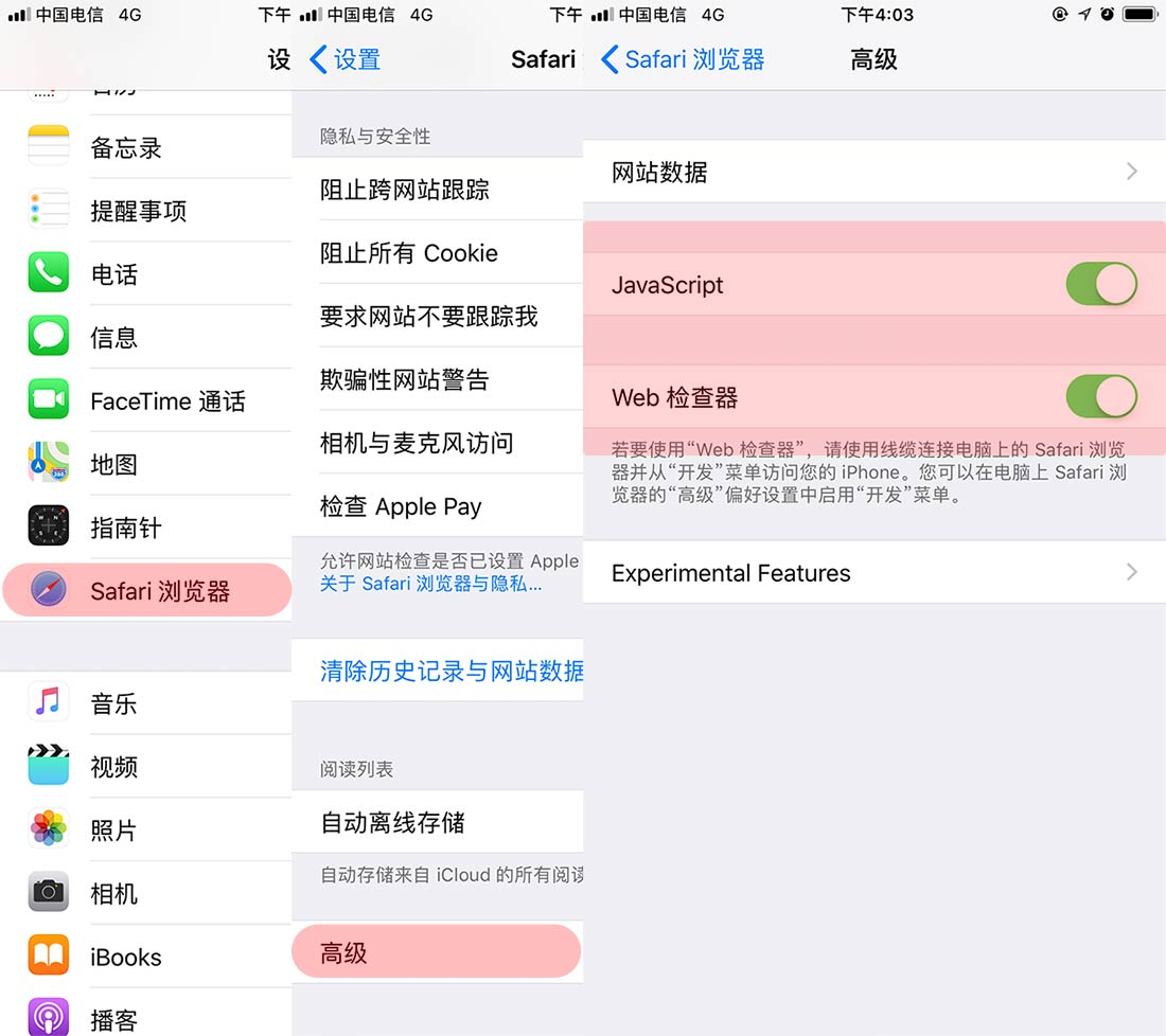 打开iPhone手机设置app 选择Safari,找到高级选项,将JavaScript开关和web检查器开关都打开。