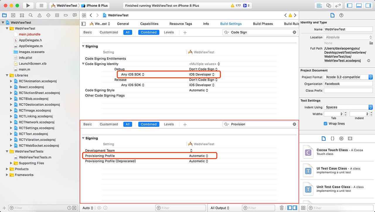 修改 Code Signing:在Xcode中,在文件目录树中选中项目名,显示出右侧的设置面板,选中 Build Settings面板。将Provision Profile设置为Automatic,将Code Sign Identity设置为iOS Developer