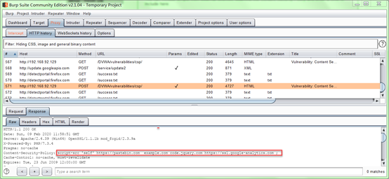 通过Burp工具,也能观察到返回的报文中CSP的内容: