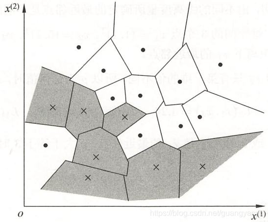 - 特征空间中,每个实例x与空间中距离自己更近的所有点组成一个区域:单元(cell),对特种空间形成一种分割,实例的y作为单元的类别,这是最近邻