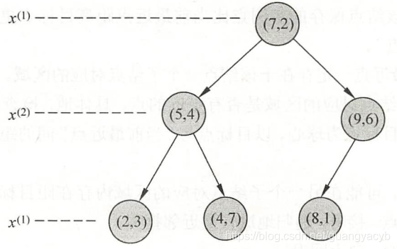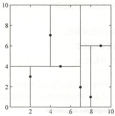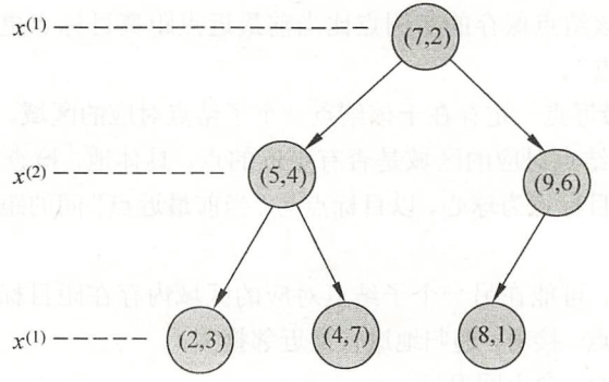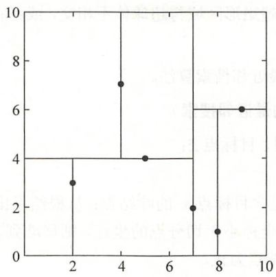 - 构造过程是初始化所有节点在根节点,选择坐标轴与其上一个切分点,用垂直于坐标轴的超平面将当前超矩形空间切分,实例划分到两个区域,持续此过程直到子区域(树节点)没有实例时终止