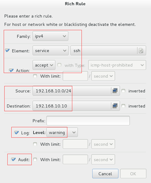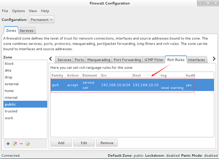 [root@linuxprobe ~]# firewall-cmd --permanent --zone=public --add-rich-rule="rule family="ipv4" source address="192.168.10.0/24" destination address="192.168.10.10" service name="ssh" accept log level=warning audit"