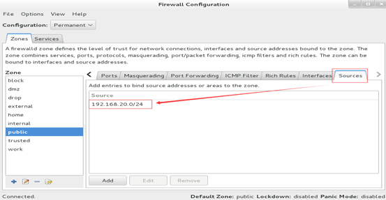 [root@linuxprobe ~]# firewall-cmd --permanent --zone=public --add-source=192.168.20.0/24