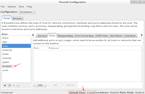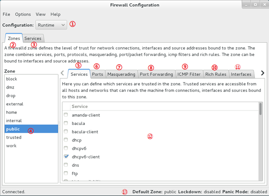 ⑬:firewall-config工具的运行状态。默认区域(可通过option菜单中的Change Default Zone进行修改),应急状况模式(Panic Mode)是否启用(enabled或disabled)。