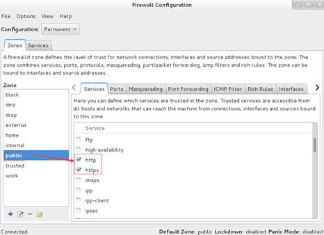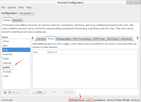 - public:默认当前正在使用的区域。注:public、DMZ、external、internal区域只允许选中的服务通过。