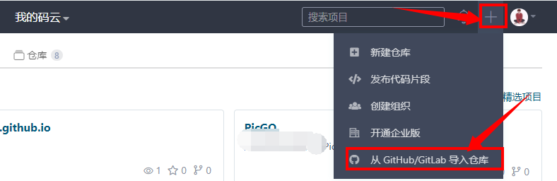 1.点击右上角新建仓库的加号 +,选择“从 GitHub/GitLab导入仓库”菜单
