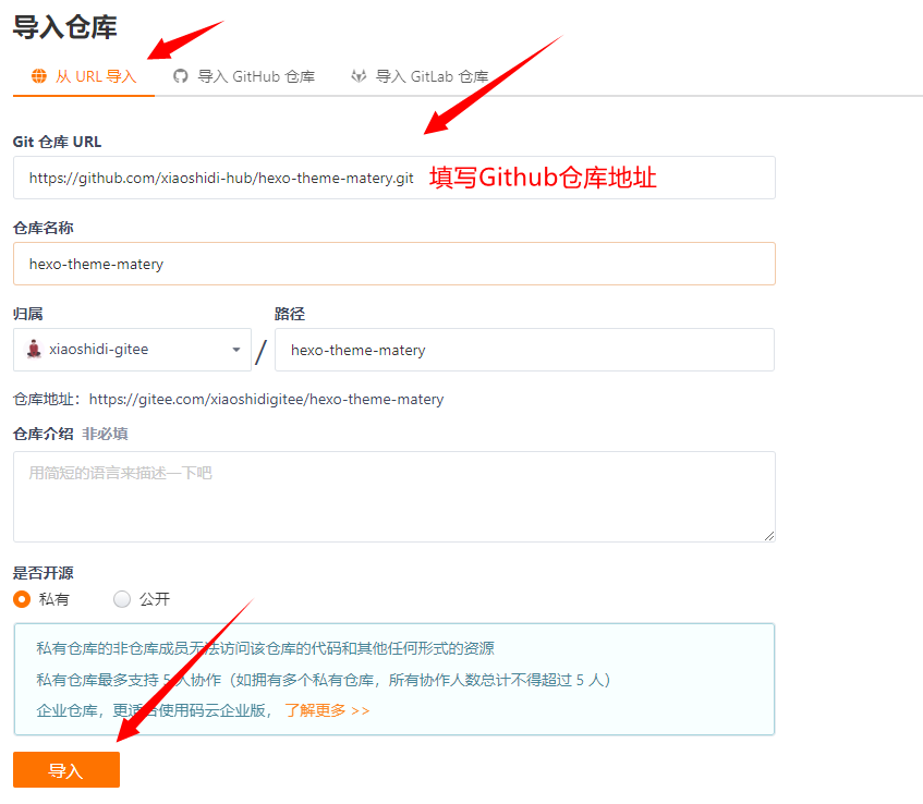2.然后填写位于 GitHub上你想 clone的仓库地址并导入