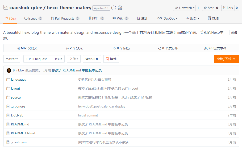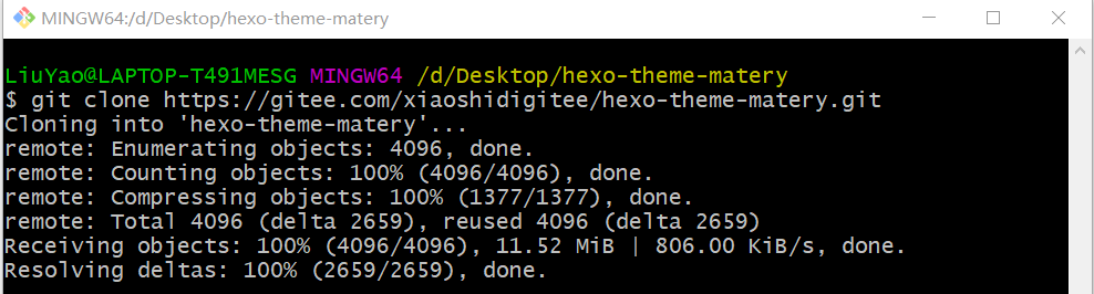 4.接下来我们通过码云上的项目地址,将项目clone到本地,这时候的clone速度就很快了,几 MB/s的速度是没问题的,很快项目就下载下来了。