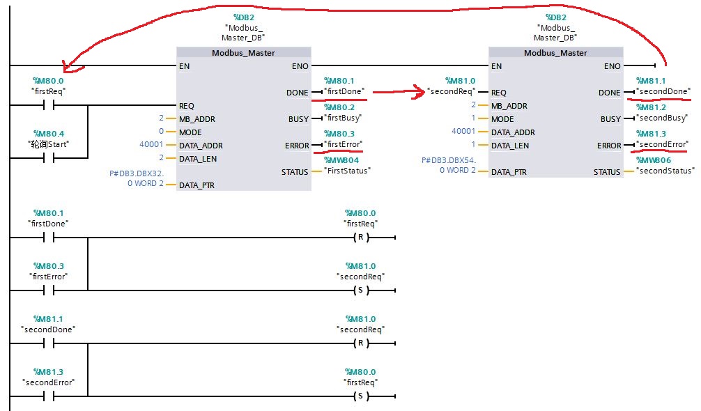 1.进入监控界面,调用一遍主站和从站的Modbus_Comm_Load指令,然后开始轮询
