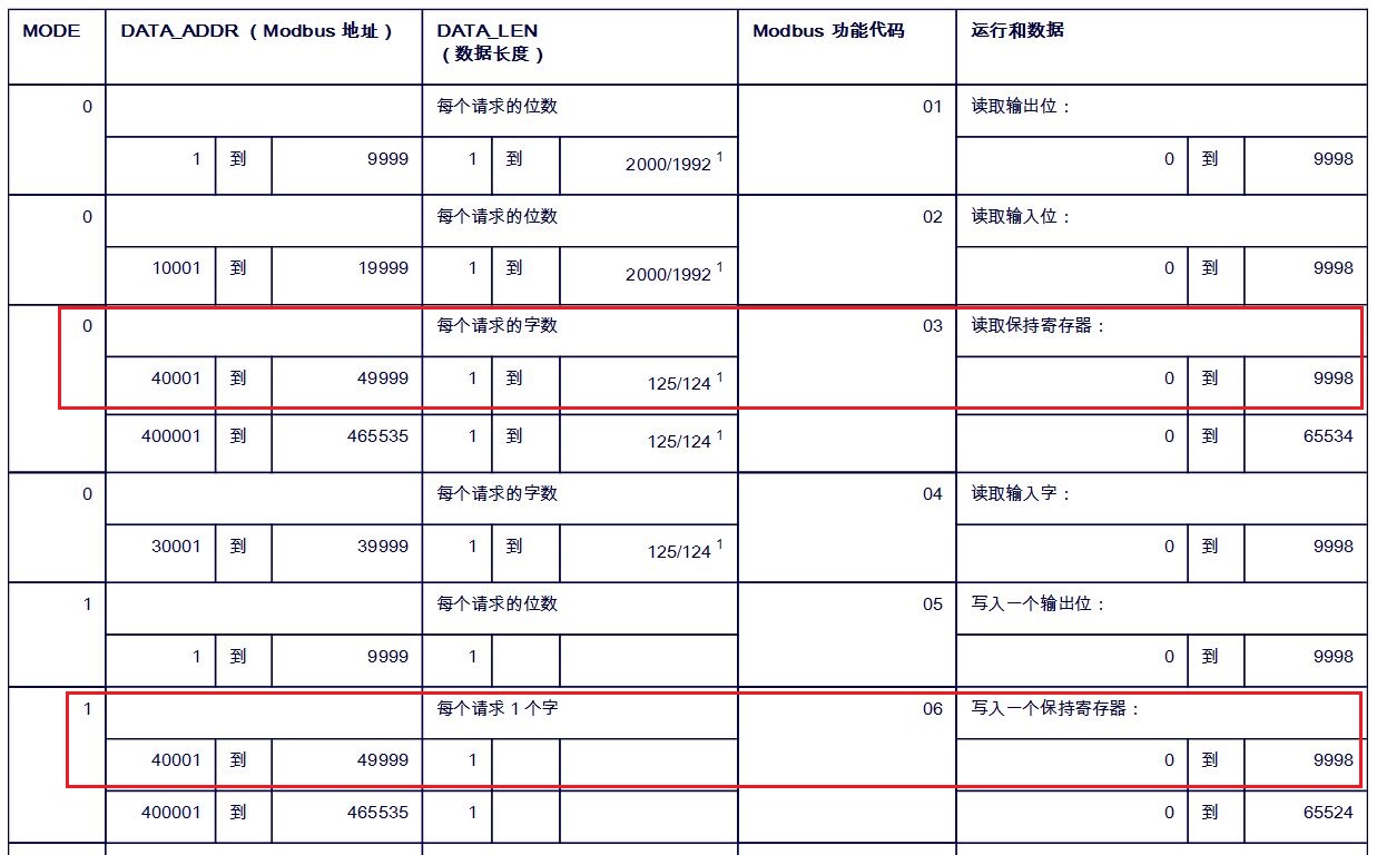 *MODE与DATA_ADDR参数的组合可以用来选择各种Modbus功能代码,具体组合查询手册可得