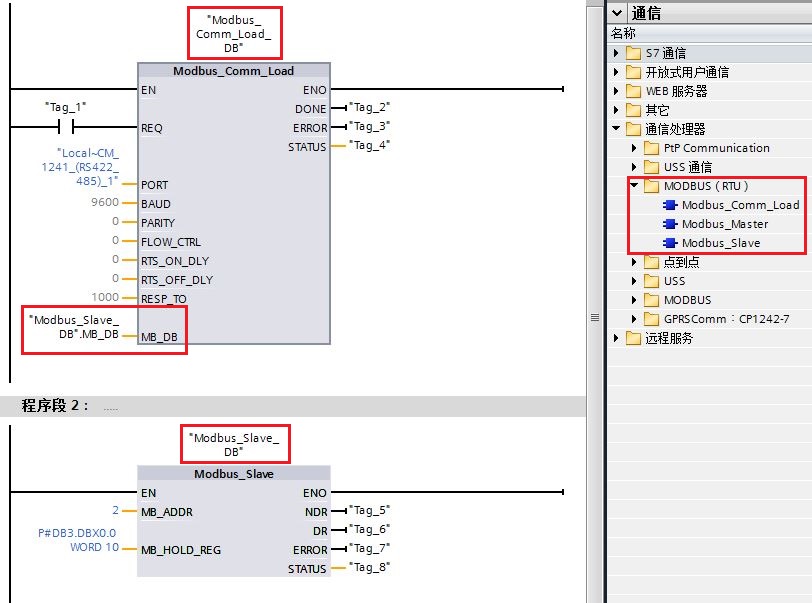 调用指令后系统会自动生成背景数据块Modbus_Comm_Load_DB与Modbus_Slave_DB