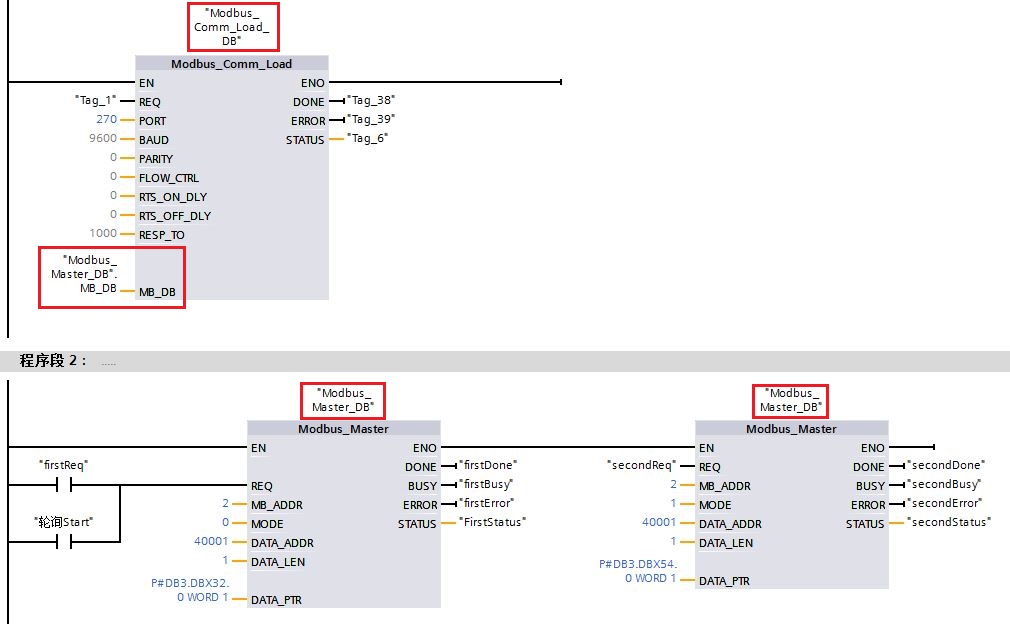 1.我们将PLC_1作为Modbus主站,在OB1中插入Modbus_Comm_Load 指令和Modbus_Master 指令