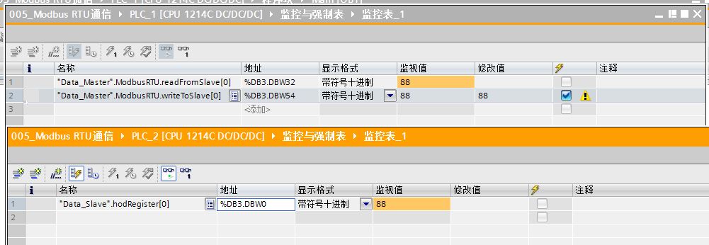 通过Modbus写入功能,将PLC_1中DB3.DBW54写入到PLC_2中DB3.DBW0