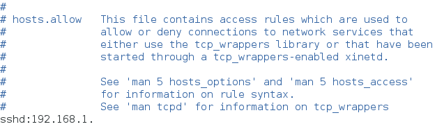 允许192.168.1.0/24网段访问本机sshd服务的所有流量 配置/etc/hosts.allow文件 加入sshd192.168.1.