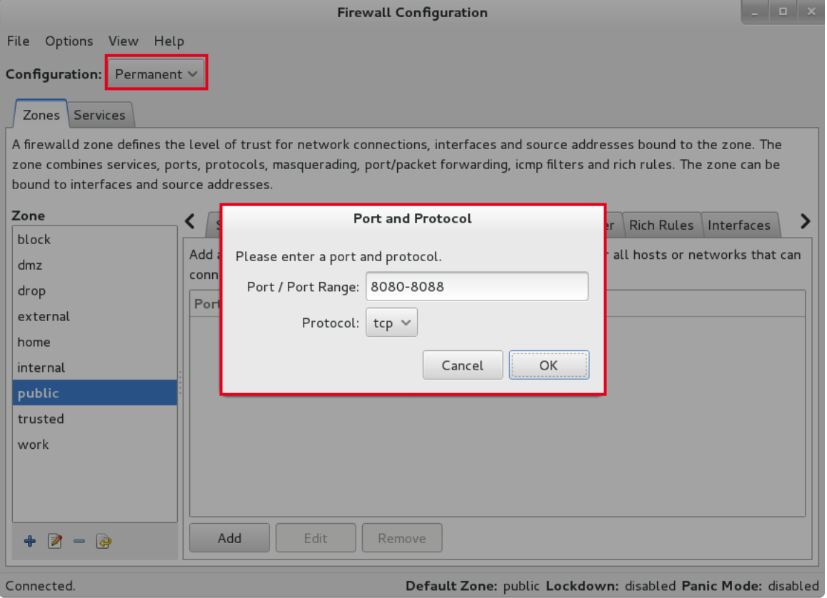firewall-cmd --zone=public --add-port=80-1000/tcp 添加80-1000的所有端口到允许列表中