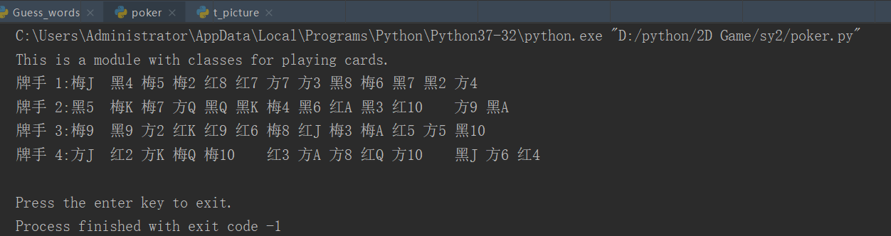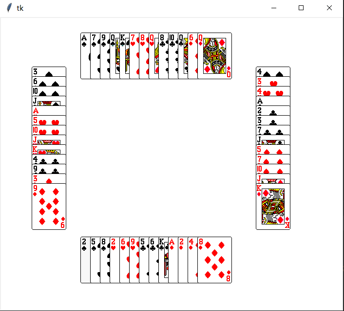 - 游戏介绍: 四名牌手打牌,电脑随机將52张牌(不合大、小王)发给四名牌手,并在屏幕上显示每位牌手的牌。